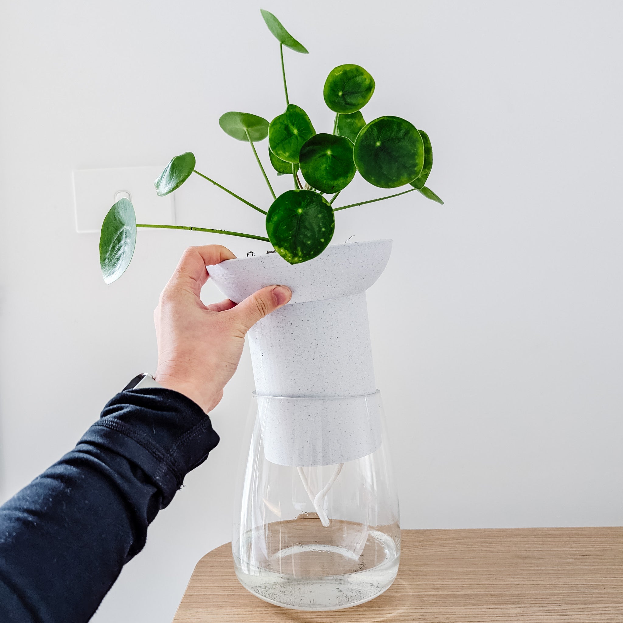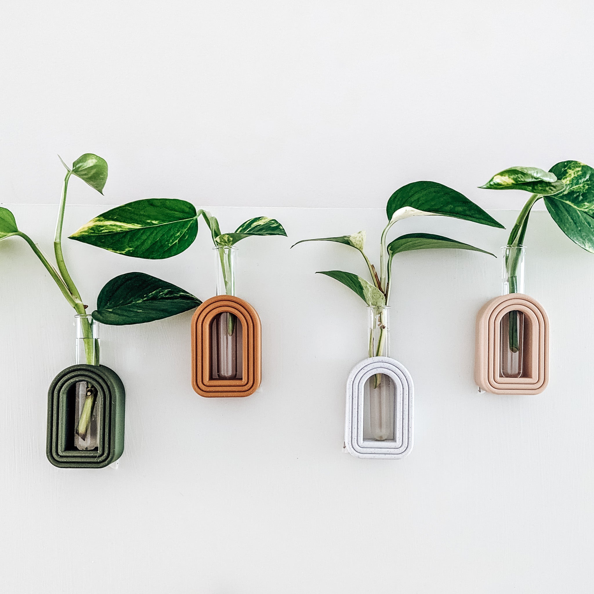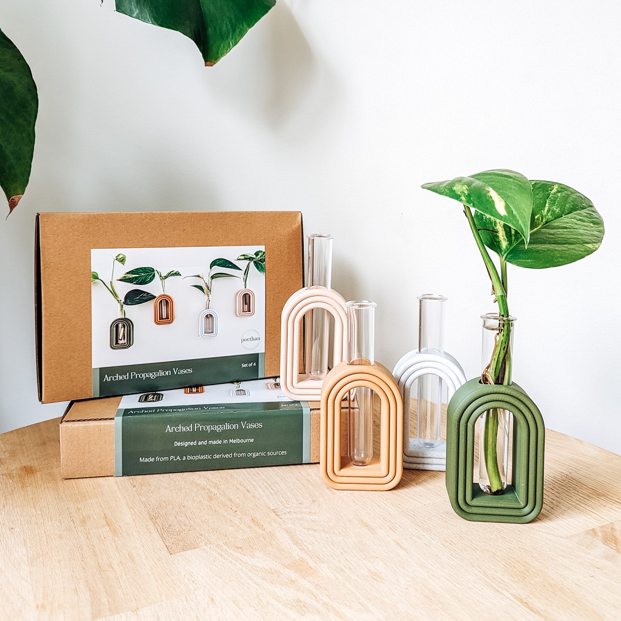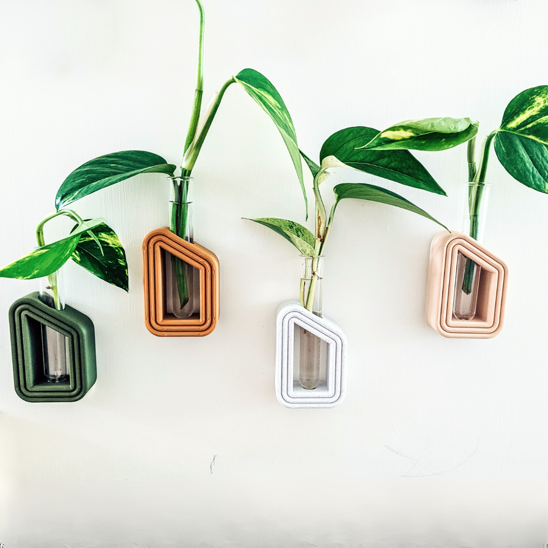 These vases are made from PLA, a plastic that's light weight and generally recognised as safe and is derived from natural sources such as corn. The base is glass.